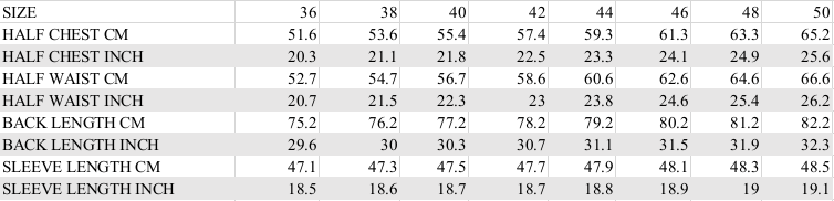 | Mens Jackets Sizes | 38, 40, 42, 44, 46, mto |